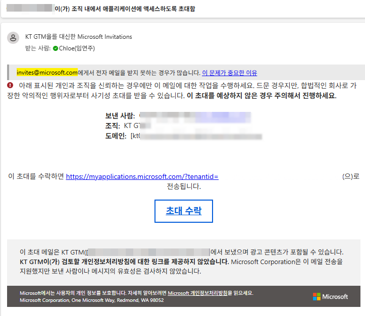 구독이 생성되면 KT에서 아래와 같은 형식의 초대 메일이 발송될 수 있으니, 수신 시 [초대 수락] 버튼을 클릭하여 승인해주시기 바랍니다.