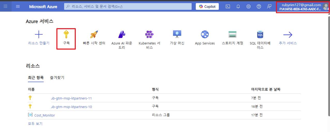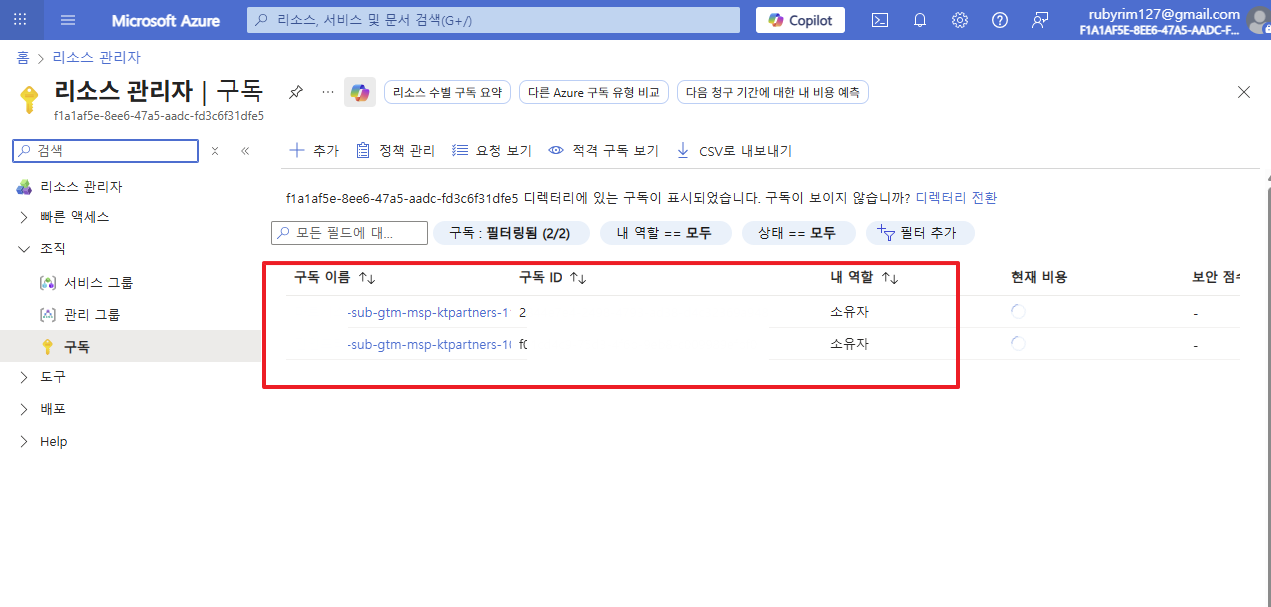이렇게 초대된 조직의 테넌트로 로그인하고, 할당된 구독까지 정상적으로 확인하였습니다.